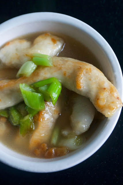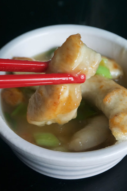 Once the chicken is just cooked and golden on the outside, quickly chop the spring onion and add it to the frying pan to soften with the cooked chicken (use a different board to the one you sliced the chicken on, or I usually just snip the spring onion into the pan using scissors).