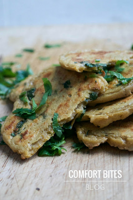 Garlic and Coriander Naan Breads. Doughy, dense, bread-like. I’ve flavoured them with garlic and freshly chopped coriander for that authentic flavour – and there’s a pinch of nutritional yeast that lends not so much a ‘cheesy’ flavour but a freshly-baked scent.