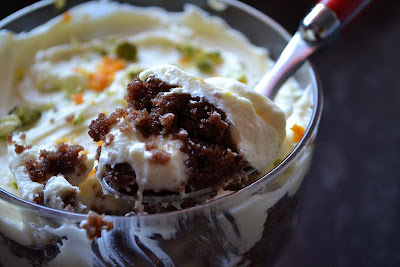 - Grate over any remaining orange zest, and top with some chopped pistachios, for colour. These little trifles are quite rich, and you only need fairly thin layers of cream between the chocolate cake slices.