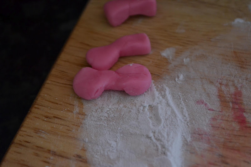 6. Cut little ribbon shapes from the pink icing and mould with your fingers to get the right shape.
