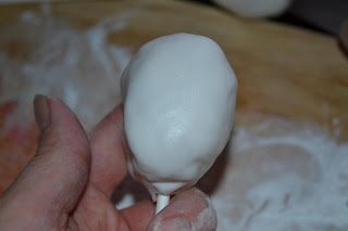 8. Take the cool cake pops out of the freezer and cover with sections of the white icing. Rub some icing sugar into them and smooth out any cracks or lumps.