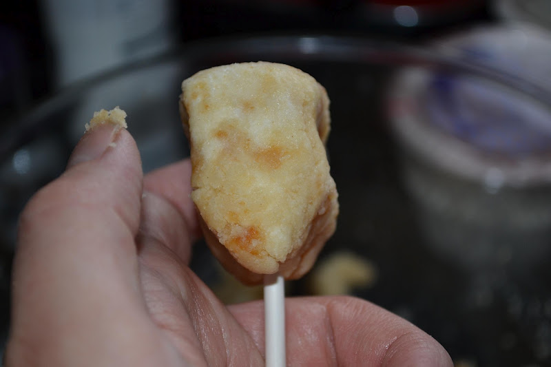 3. Form a ball out of the sticky mixture and spear it with a cake pop stick. (I got mine from Lakeland but clean lolly sticks will also work). Mould the ball into a head shape, with a pointy bit at the end for the chin. Try not to make your balls of mixture too big, or they can get too heavy and slide down the stick when they’re finished, ruining your lovely icing.
