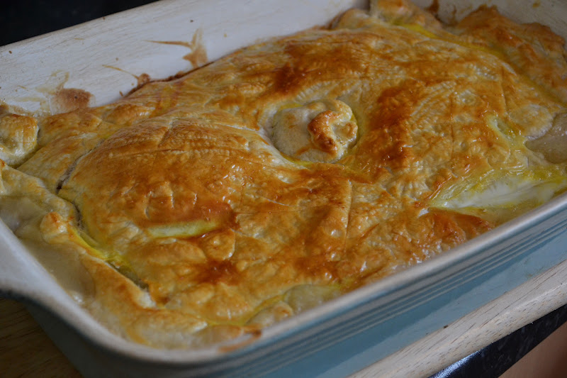 - Take out an ovenproof roasting dish and tip in the creamy chicken mixture. Unravel the roll of puff pastry and lay over the top of the pie filling. Gently, without cutting through it, score the top of the pastry with a sharp knife, making a chequerboard effect. Brush with the beaten egg and bake in the oven for 15-20 minutes, until the pastry is golden and the creamy sauce is bubbling up around it.