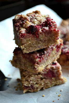 This recipe makes quite moist, chewy flapjacks – if you like them more brittle, just cook it for a bit longer or push into a wider tin, so they end up thinner. You can use whatever frozen berries you have handy – I bet they’ll be lovely with blueberries, too – but these raspberry ones are great with a cup of coffee.