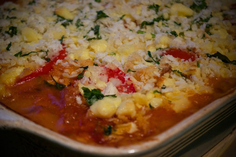5. Take out the roasted vegetables and arrange half of them into a large roasting dish. Pour half of the tomato sauce over the top and then arrange the rest of the veg over the top. Pour the remaining tomato sauce and smooth over. Next, tip the thick cheese sauce over the bake, spreading it on like a big blanket. Top with the tomato slices.