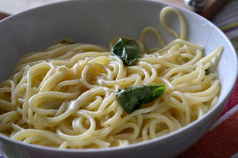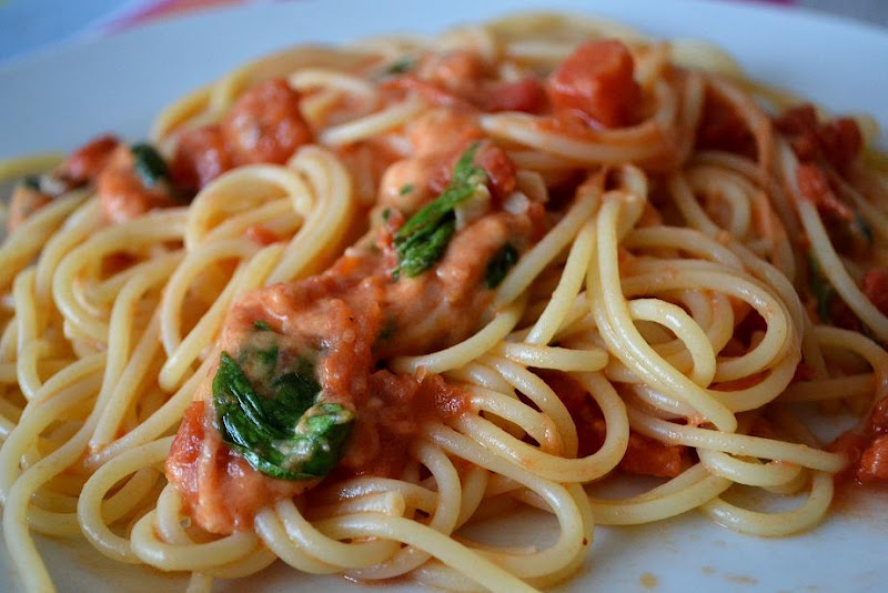 Gluten-free spaghetti with tomato, basil and mozzarella sauce.
