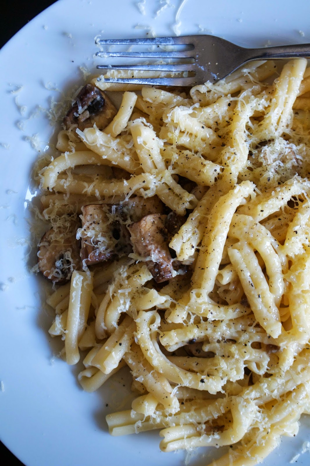 Drain the pasta, reserving about half a mugful of the starchy cooking water, and tip it into the mushroom mixture. Add a little of the water to make a loose sauce and have a taste, adding a little more salt if you think it needs it. Serve hot, with a sprinkling of grated cheese and some black pepper.