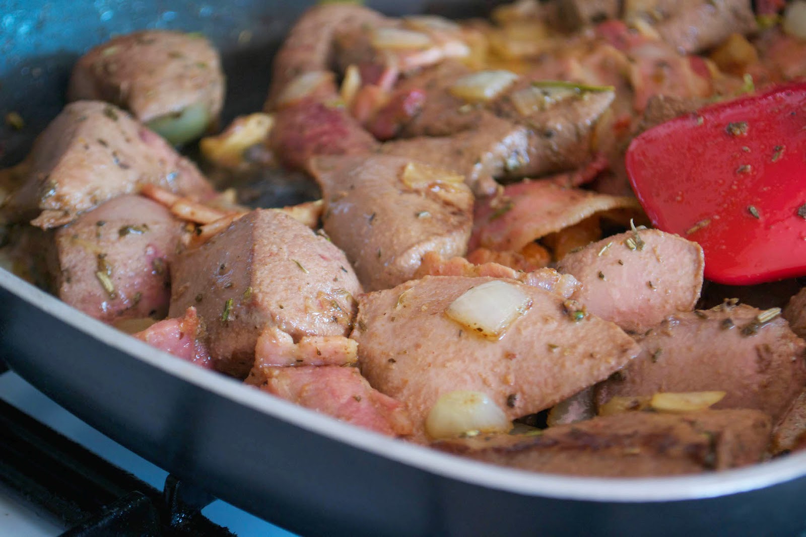 Put this quarter cup of fat into the pan and gently cook the onion and garlic until softened. Add the sage, rosemary, bay leaves, mace and thyme. Next, chop the pig’s liver into bite-sized pieces and add these to the pan, shaking and stirring so they cook evenly. Chop up the cooked bacon rashers you reserved earlier and add these too. Once the liver has sealed on the outside, pour in the wine and let it bubble up for 2-3 minutes until the smell of alcohol has gone. Remove the bay leaves and tip in the remaining quarter cup of fat. Cook for another 1-2 minutes.