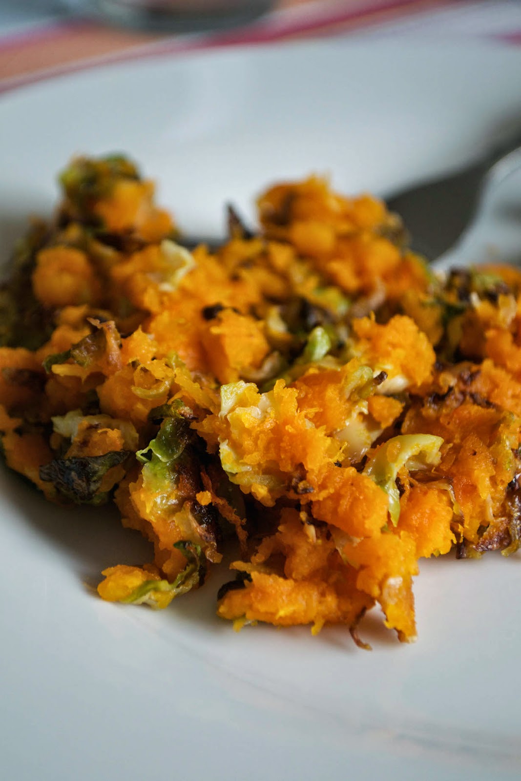 Melt a teaspoon of butter, coconut oil or lard in a large non-stick frying pan. Add a small chopped white onion and fry until tender and just beginning to turn crisp. Add in a handful or two of leftover mashed butternut squash or sweet potatoes. Stir it all together and add a handful of finely sliced Brussels Sprouts. Cook, stirring, until the veg is all hot and reheated, and the onions and sprouts start to take on a dark crispness to them, sizzling in the pan. Sprinkle in a pinch of salt and you’re ready to go. Eat hot.