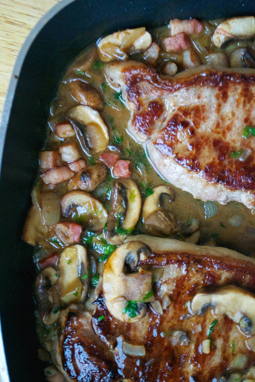 Pan-Fried Veal Steaks with Mushroom and Bacon Sauce