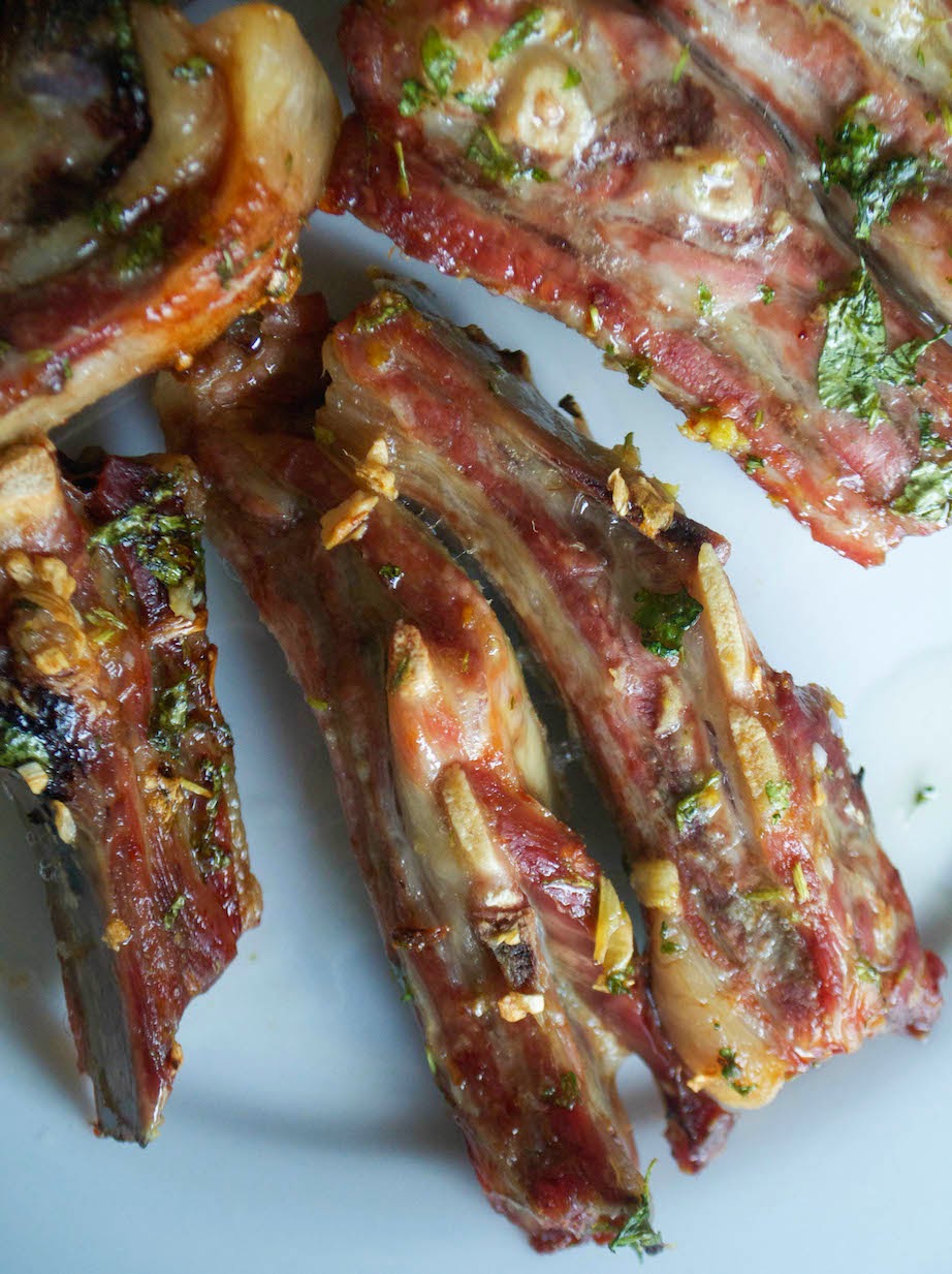 They’re cheap, and if you’re lucky, fairly meaty – although I’ve had bad experiences with supermarket ribs in the past that were all fat and bone. Now I get them from an organic, free-range butcher and they’re always lovely, with enough succulent, sweet meat you pull away from the bones with your teeth. And for the seasoning, I took a tip from Argentina and decided to keep it simple with garlic and parsley.