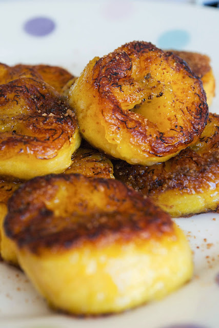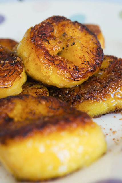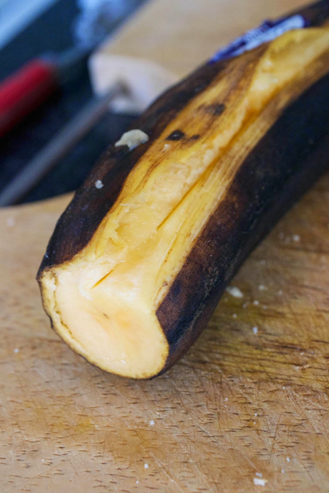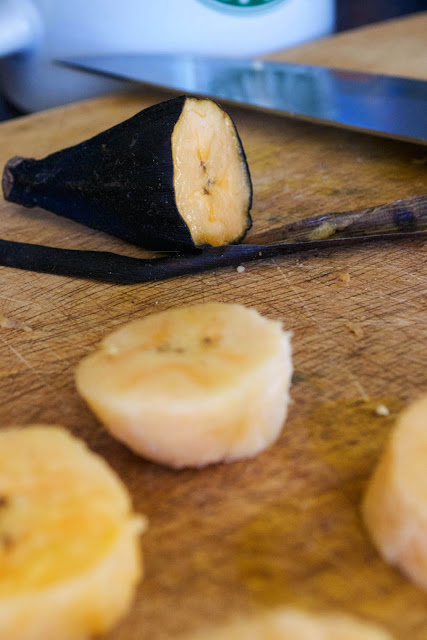 When a plantain has gone completely black, the skin becomes much thinner and easier to peel. The plantain inside turns a soft, creamy yellow – almost custard-like. But whereas an over-ripe banana would turn very mushy and difficult to slice, a plantain keeps its shape and stays a bit starchier. The flavour is toffee-like, kind of like banana but with a tropical flavour in there somewhere and kind of appley and a bit like honey. Yes, I realise my description is somewhat vague and wordy. You’ll just have to try it for yourself, and then you can make your own mind up.