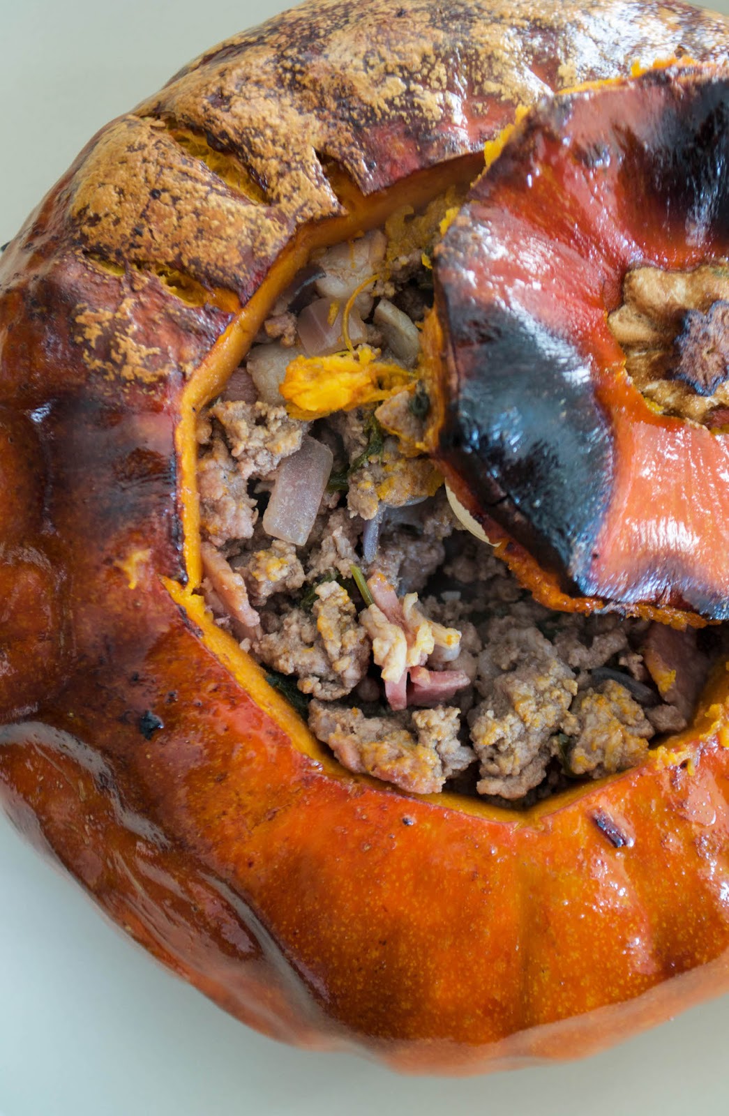 Slide the stuffed pumpkin into the hot oven and cook for 45-50 minutes, until the pumpkin is tender and sizzling. It might look a little burnished and roasty on the outside – that’s even better. Using the spoon or spatula, press gently on the pumpkin lid – you might mind some of the hot beef juices spill out. This is normal.