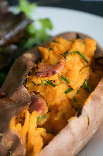It’s getting more and more difficult for me to enjoy fluffy baked sweet potato without some bacon somewhere alongside. Especially since I started enjoying the sweet potato mash recipe in the book Eat Drink Paleo.