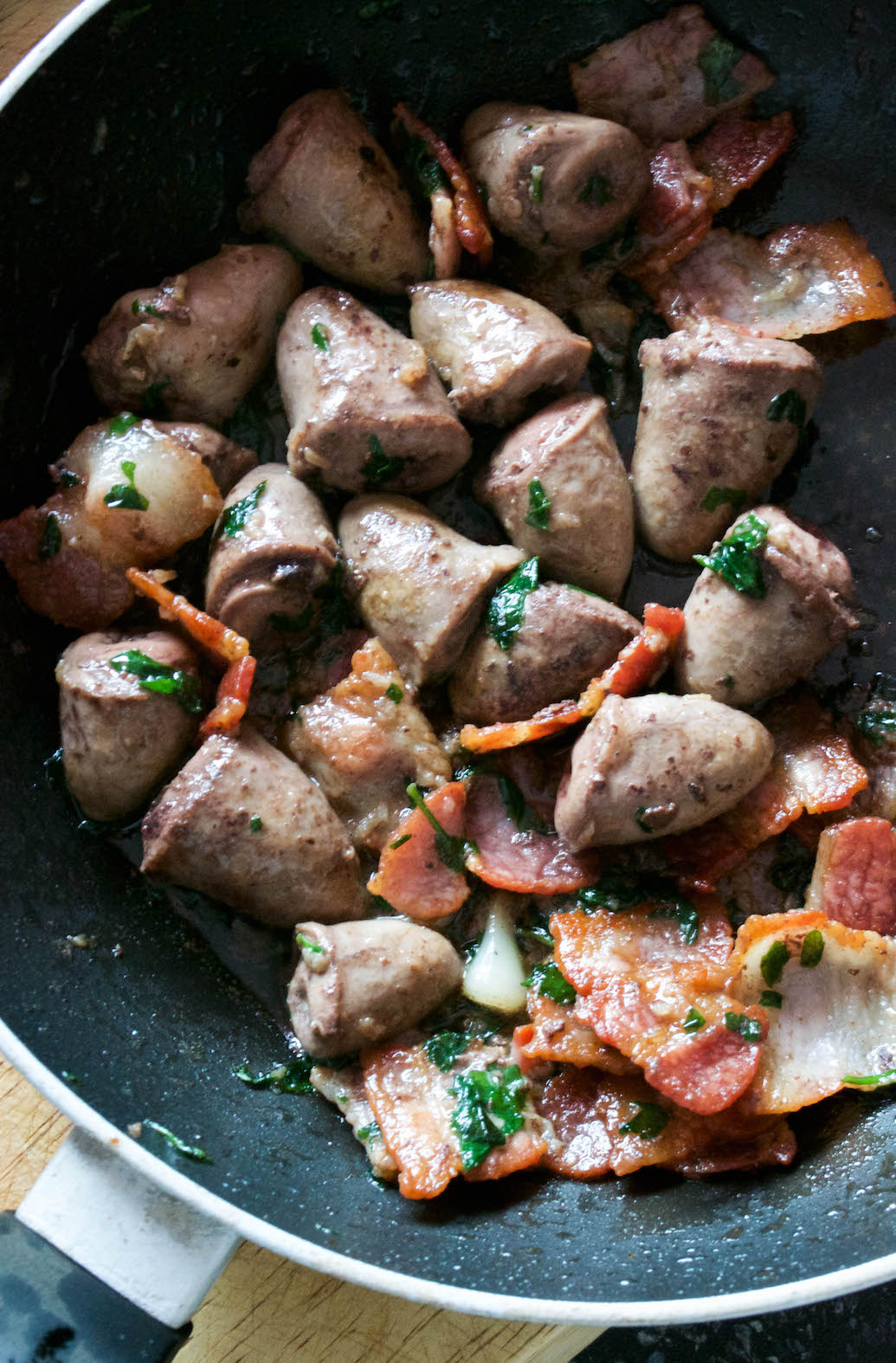 It was my first time eating them, and I was incredibly surprised. They’re not chewy – I imagined them to be full of tendons and valves and stuff – but they were smooth and succulent. They tasted sweet – not gamey like liver or kidney, but similar to the creamy sweetness of a really good pâté. And they take just a few minutes to cook. It’s probably one of the easiest dinners you’ll ever make. And if you’ve never eaten hearts before, I’d say chicken is a good place to start.