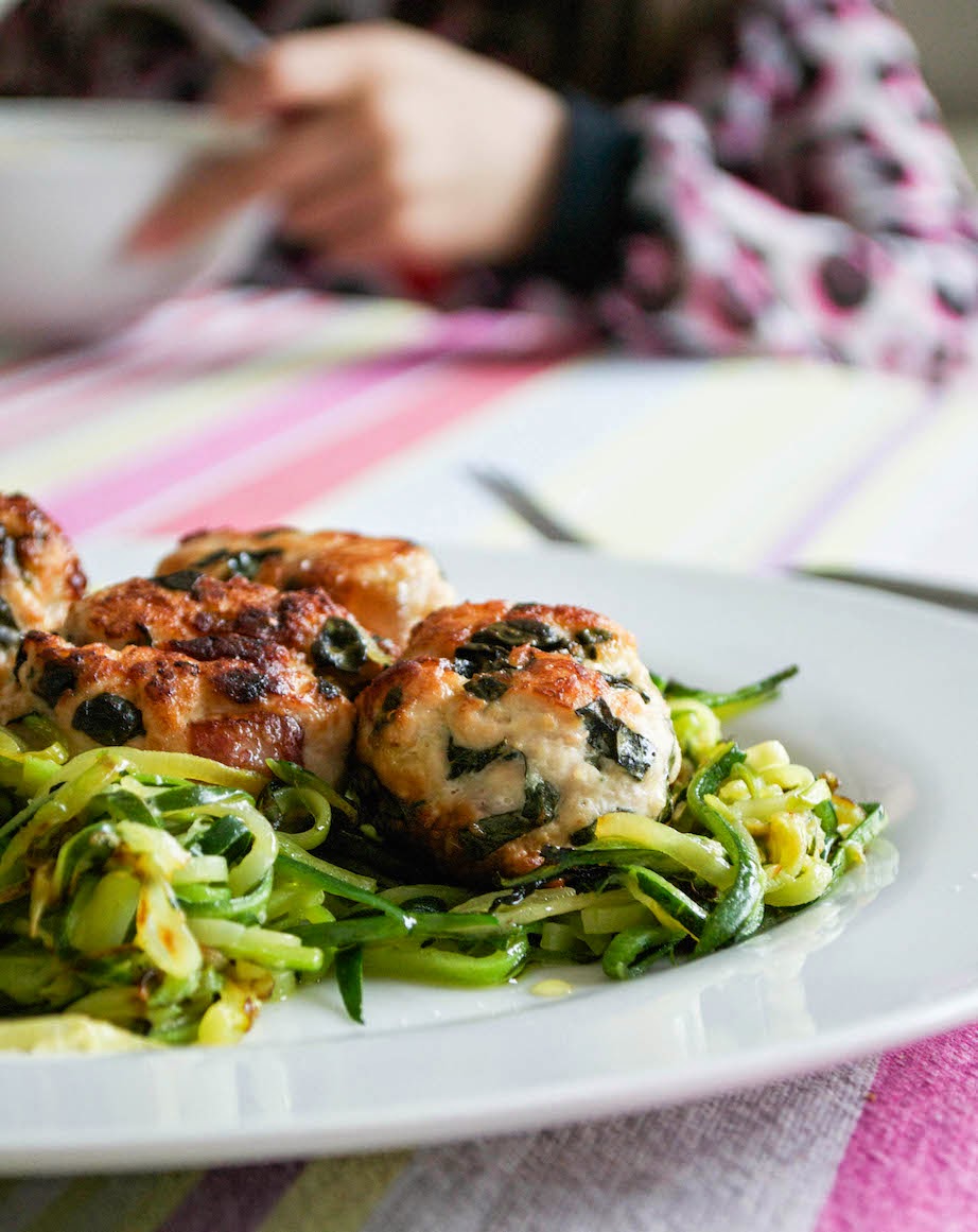 I love the earthy flavour that the cabbage gives to the meatballs and you’re getting an extra bit of veggie in there that you don’t really expect. I also love the colour they give. The girls ate theirs with some tomato sauce and gluten-free pasta but we ate ours with fried courgette strips.