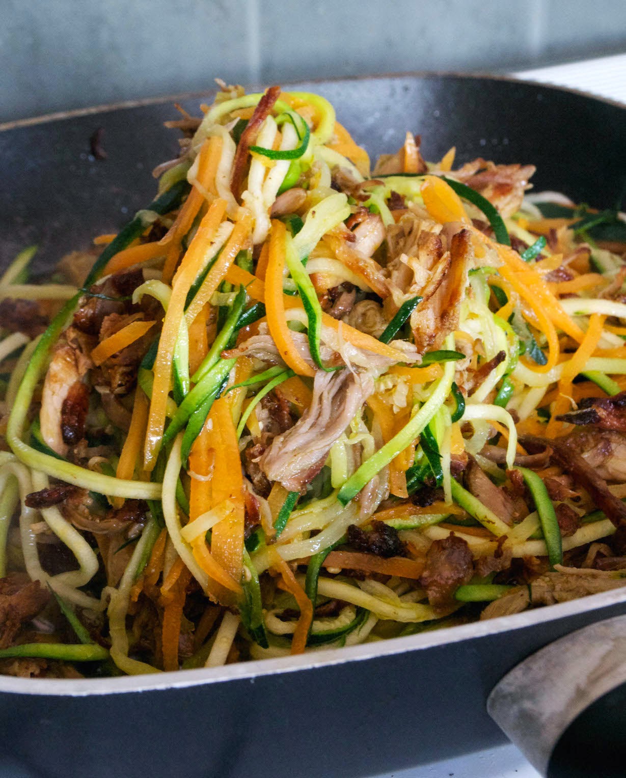 Heat the avocado oil in a large frying pan or wok and add the leftover pulled pork, breaking it up into smaller pieces with your fingers, as you drop it in. Stir-fry on a lowish heat for a few minutes, until the pork is heated through. Turn up the heat and the pork will start to turn crisp and more golden at the edges. Once the pork is heated through, add the vegetable strips and stir-fry everything together. They’ll wilt down and cook through in 2-3 minutes. Add a pinch of the garlic salt and mix well.