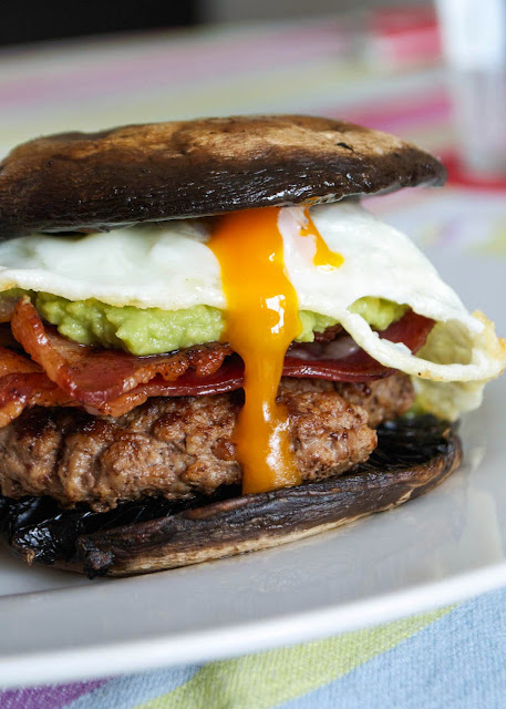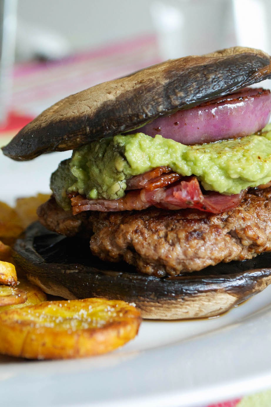 On a plate, place one of the cooled, roasted flat mushrooms underside up. (You might want to tip out some of the moisture before you do this if it’s especially juicy). Carefully place the cooked burger on top, followed by the bacon rashers and the guacamole. Top with the onion slice and then another mushroom, underside-down on top.