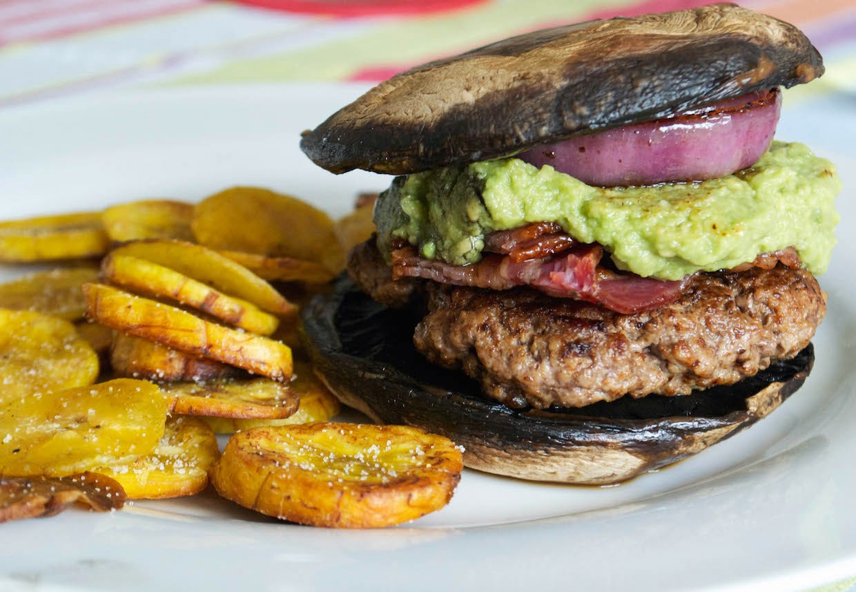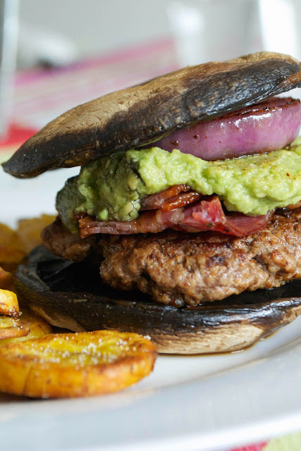 It’s a beef burger, but the bun is made out of two mushrooms, and then I’ve filled it with a juicy beef patty, zesty guacamole, bacon and a softened chunk of red onion. As you may have seen if we’re friends on Instagram, I’ve been playing about a bit with AIP and Paleo burgers, lately.