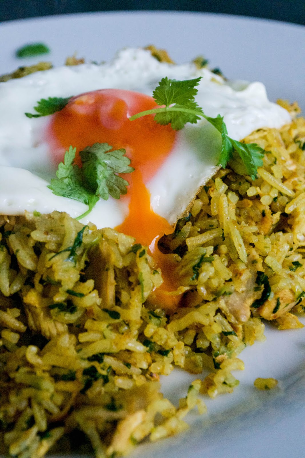 In the morning, I came downstairs, opened my eyes and blinked into the fridge. There was a single serving of leftover rice and chicken curry. I took it out of the fridge, stir-fried it in a tiny bit of mild, flavourless coconut oil until a bit crispy (there wasn’t much sauce) and added a block of chopped, frozen spinach. Once it was sizzling and heated through, I topped it with a fried egg and ate it.