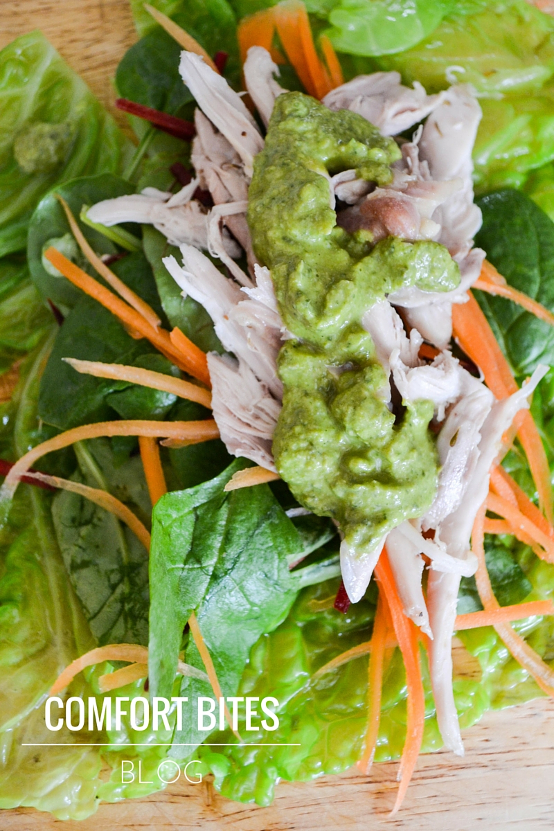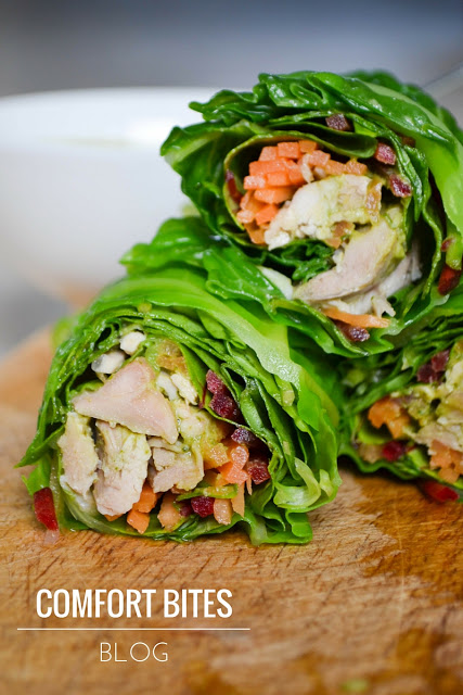 Bring the leaves over to a chopping board and dry them on a clean kitchen towel. Put one on the board and scatter over some salad leaves, the carrot and chicken. Spoon over a little of the pesto and then start to wrap up the leaf.