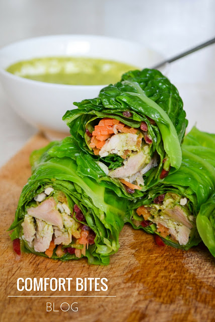 I added in some leftover chicken I had in the fridge, some salad leaves with beetroot strips and some julienned raw carrot. I also lightly cooked the cabbage leaves and then cooled them quickly in cold water, so they’re easier to wrap and easier on the digestion. I also had a bowl of my artichoke heart and basil pesto in the fridge, so dolloped a big spoonful of that all over, too.