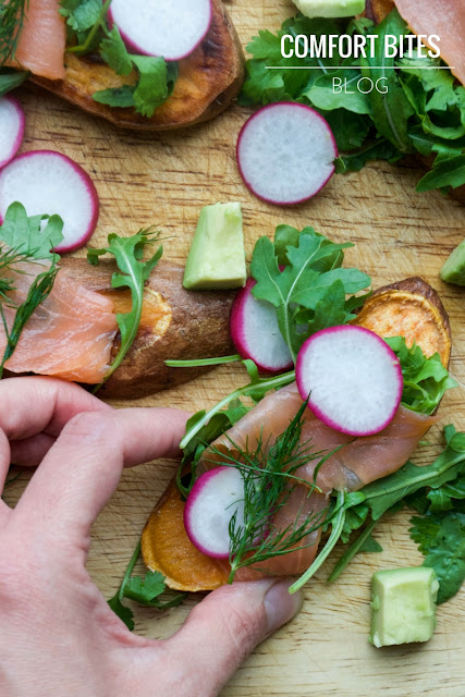 Soft, smoky salmon. Sweet, tender sweet potato slices. Crunchy radish. Dill.