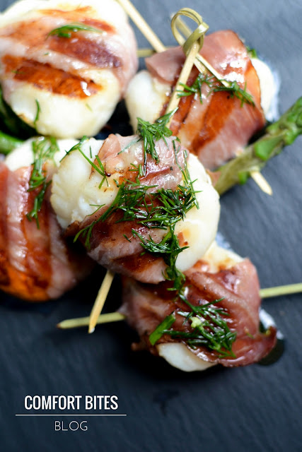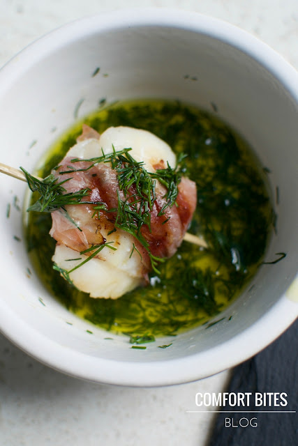 A sweet-salty snack of King scallops wrapped in prosciutto ham and drenched in a zesty lemon and dill dressing. Skewered and ready for the grill or barbecue.