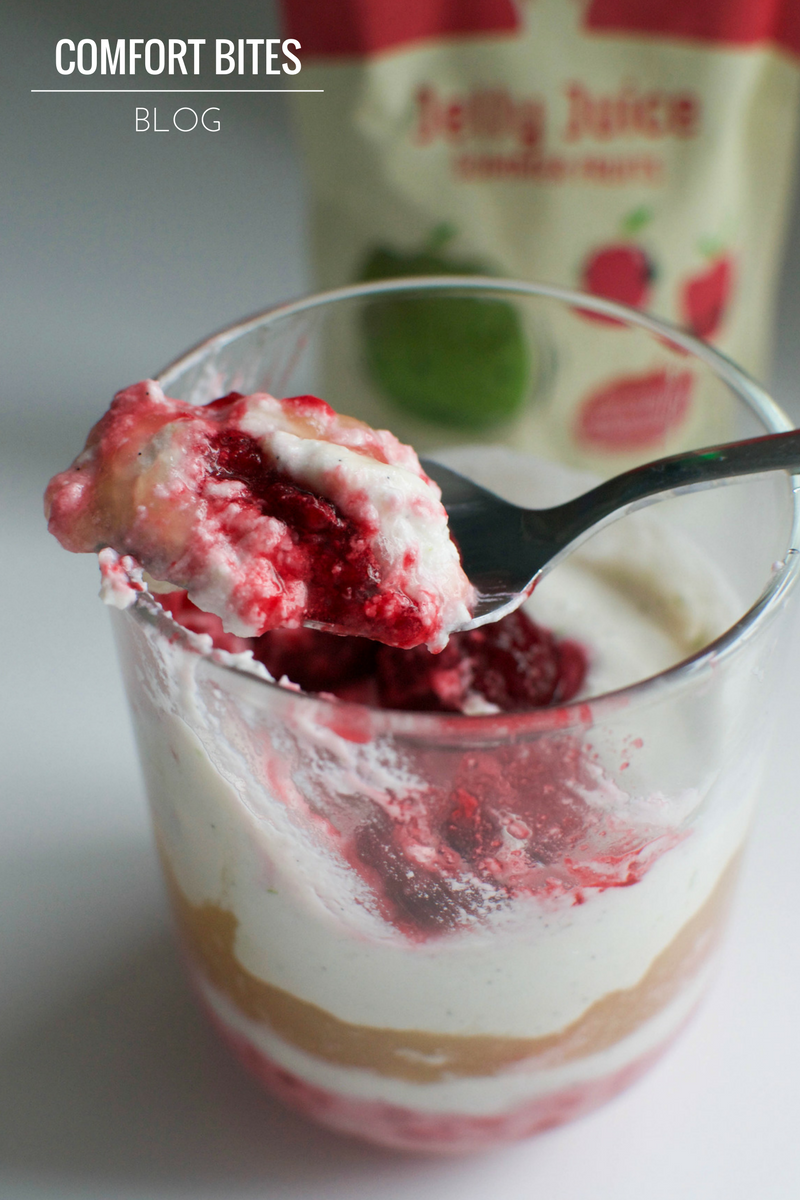 Whisk the coconut cream, vanilla and lime together exactly the same, as above, and transfer two tablespoons of it to another, small bowl. Crumble in 3-4 raspberries (I used defrosted frozen ones) and mash them up into the coconut cream until it’s pink. Spoon this into the base of a shot glass. Next, spoon in a little more of the plain lime and vanilla flavoured coconut cream. The next layer is a good squeeze (about half a pouch) of Jelly Juice Tropical jelly. Finish off with the rest of the coconut cream mixture and then top with fresh or frozen raspberries. Chill, until ready to eat.