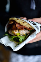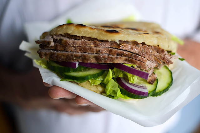 Once the lamb is cooked, take it out and place on a board. Slice very thinly and layer up in between the flatbreads with the lettuce, red onion slices and cucumber. Wrap in a food wrapper or square of greaseproof paper to make it easier to eat, and tuck in.