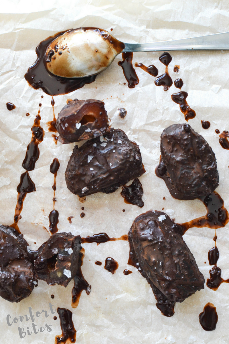 Sticky Medjool dates, with the stones taken out (we don’t want you cracking your teeth on these bad boys), dipped in a carob mixture and left to harden, but not before scattering with sea salt flakes.
