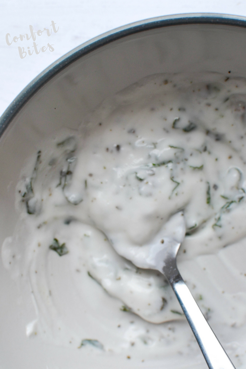 While the chicken is sizzling away, start on the dip.