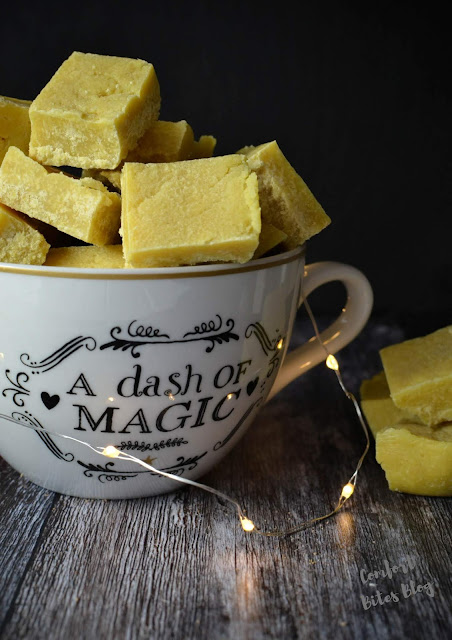 Gently melt the creamed coconut in a small frying pan, until softened. Give it a stir, and add the turmeric, ginger and coconut milk. Trickle in the honey and turn off the heat. Mix well, until fully combined, and pour into a small 9 inch by 3 inch container, lined with cling film or baking parchment. I used a small loaf tin. Slide into the fridge and chill until set – preferably overnight.